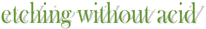 The use of Sodium Chloride (brine or salt solution) as an electrolyte in galv-etch or any type of electro etching is often advocated, and assumed to be safe, convenient and economical. But there are complex chemical reactions involved that are not as safe as the solutions recommended for etching Copper, Zinc and steel described in Green Prints and this website. They result from the separation of the Chlorine ions and the Sodium ions in the water solution, and their reactions with the metal ions of the anode plate or in solution. There are secondary reactions between the solutions produced which result in more or less toxic and unstable precipitations. For nearly all metals there are large volumes of insoluble precipitations produced, which can block lines and prevent even etching, and require frequent filtering of the electrolyte. There is always copious production of hydrogen which is explosive and to which many people are allergic. The process of electrolysis is not reversible, in other words, metal cannot be deposited on a plate or object by making it the cathode instead of the anode. The filtered solution cannot be used indefinitely as its chemistry and concentration can change over time, and must be disposed of safely.