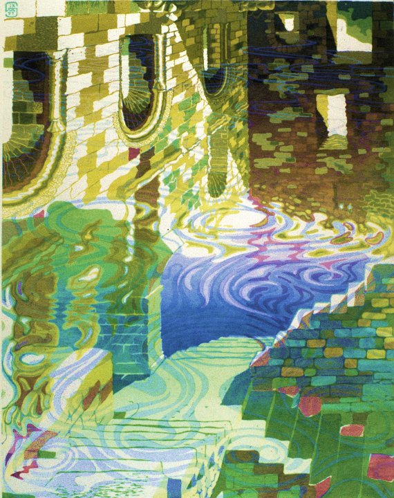 6 'Atlantis 1- reflections, shadows and refractions' - screenprint, image size 25 x 46 cm - 9 colours using water based screenprinting inks on Fabriano paper. Image based on ruined abbey at Boschaud in France. Part of the series illustrating the book 'A Modern Atlantis'.