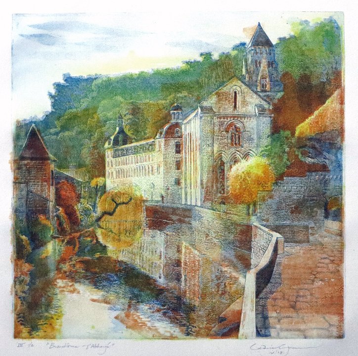 5 'Brantome Abbey' - image size 33 x 33 cms - 3 galv-etched plates, proofed intaglio from master copper plate in 1 colour and overprinted from 2 zinc plates in relief. Printed on Saunders Waterford 180 gsm paper.