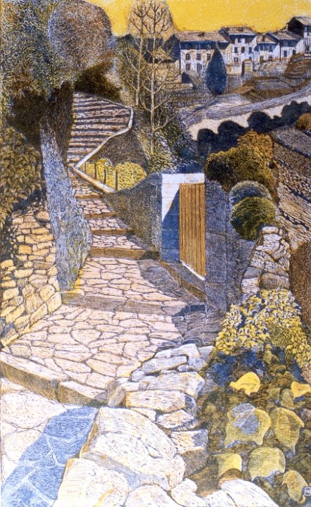 19 'Nontron - spring' - image size 38 x 56 cms - 3 deep etched plates, proofed in 3 colours in relief on Saunders Waterford 180 gsm paper. This is one of the Nontron Seasons series, using the same set of plates but proofed in different colour combinations to represent the same image at different seasons.